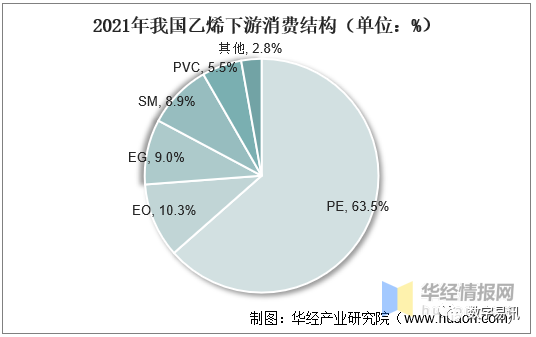 我國乙烯工業(yè)已逐步進入成熟期,下游衍生物主要有PE、環(huán)氧乙烷(EO)、EG、SM、聚氯乙烯(PVC)等產(chǎn)品。五類產(chǎn)品共占乙烯總消費量約97.2%。其中,最大消費領域是PE,占總消費量的63.5%。其次是EO和EG,分別占10.3%和9.0%。