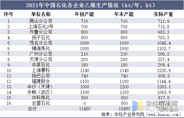2021年中國石化各企業(yè)乙烯生產(chǎn)情況(kt/年,kt)