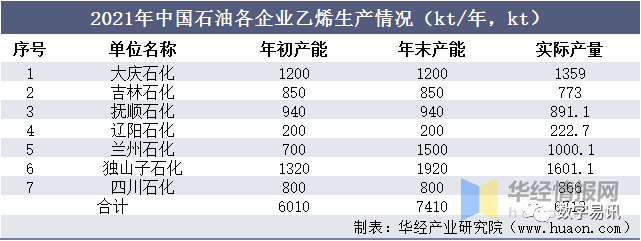 2021年中國石油各企業(yè)乙烯生產(chǎn)情況(kt/年,kt)