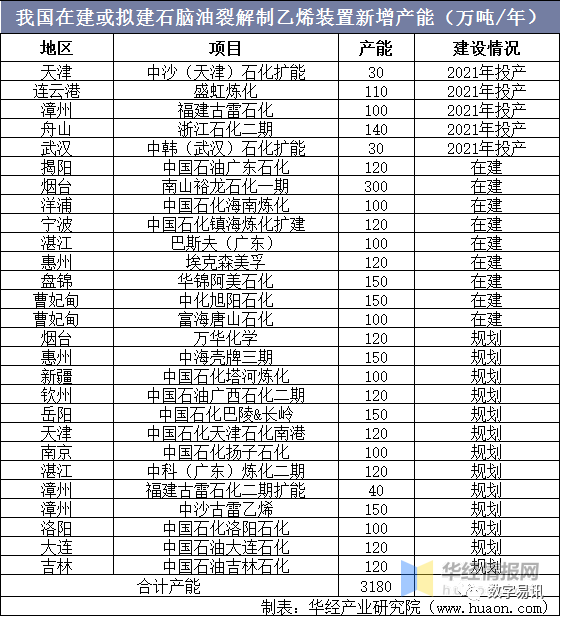 在乙烯盈利能力普遍穩(wěn)健、供需缺口較大的情況下,新建煉化一體化項目均配套大乙烯項目。隨著一批煉化項目配套乙烯裝置投產(chǎn),加之部分擴能改造項目,預計2021–2024年,我國將新增石腦油裂解乙烯產(chǎn)能約1670萬噸/年,另有規(guī)劃中的乙烯產(chǎn)能約1510萬噸/年,合計新增產(chǎn)能約3180萬噸/年。