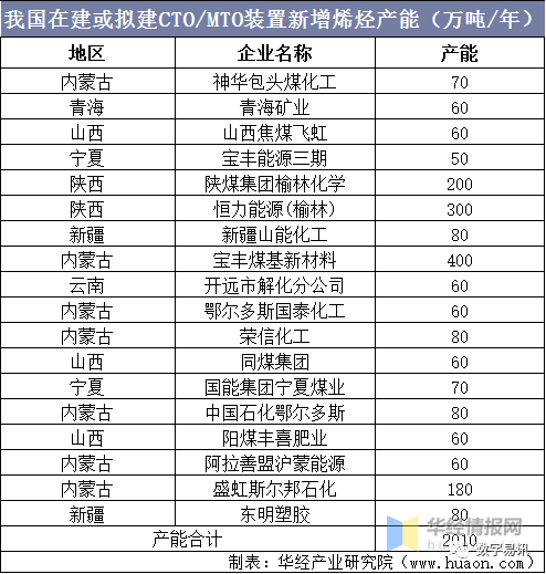 我國在建或擬建CTO/MTO裝置新增烯烴產(chǎn)能(萬噸/年)